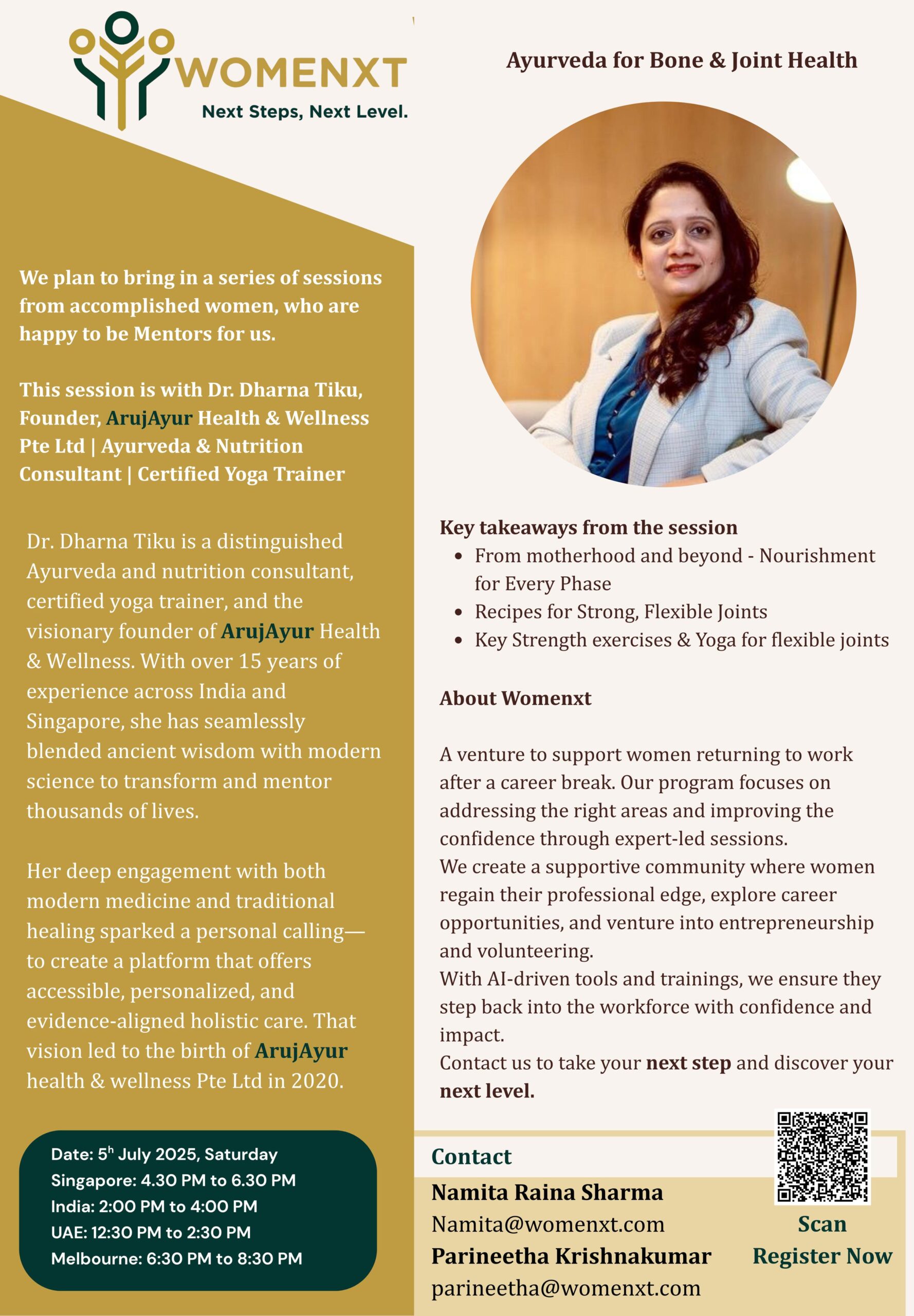 Webinars Ayurveda for Bone & Joint Health – Dr. Dharna Tiku, 05 Jul 2025 Online 16:30-18:30 Singapore Time Free
